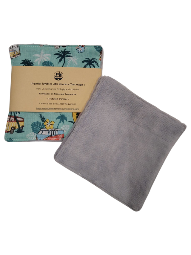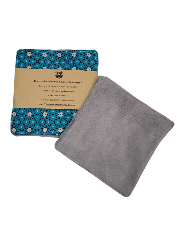 Chaque lingette est confectionnée avec soin, mêlant un joli coton à motifs et une éponge de bambou toute douce.